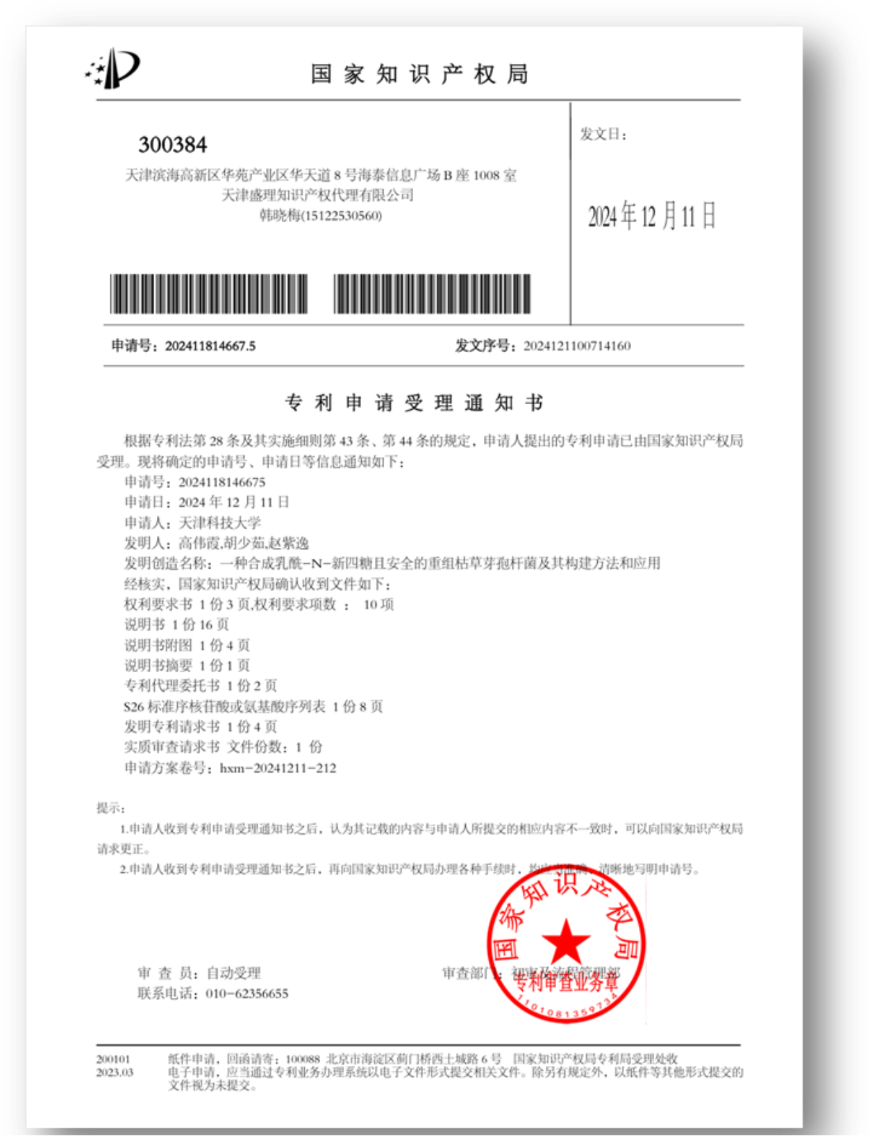 可作为食品安全级别菌种申请和授权专利