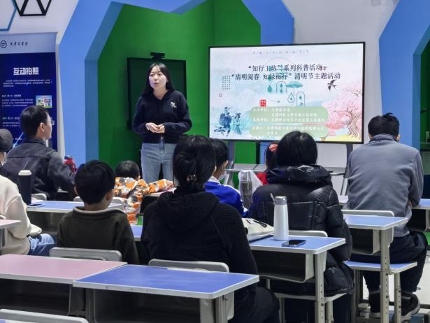 博士生、天津经开区蓝天救援队志愿者王雪玉首先通过《二十四节气歌》带领青少年们感受古人的天文智慧,随后系统讲解清明节的历史渊源与文化内涵。她结合《帝京岁时纪胜》、《清嘉录》等古籍记载,详细介绍了扫墓祭祖、踏青植树、放风筝等传统习俗,并特别展示了清明螺、青团等特色饮食文化,让孩子们在“听故事、赏诗词、品民俗”中感受传统文化魅力。