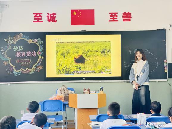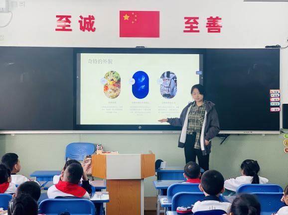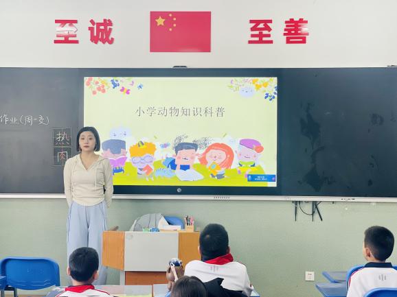 课后服务志愿者2022级本科生朱润砚、卫馨悦结合专业知识,以生动形象的动画和通俗易懂的文字,给小朋友介绍了自然界中常见的动物,其中包括动物的分类、生活习性和自然界中部分动物的特殊技能比如变色、冬眠、迁徙等,引起小朋友的关注和热情。活跃的课堂氛围和提问环节更加深了他们对生物学科的好奇心和探索欲,点亮了孩子们生物世界的一盏灯。