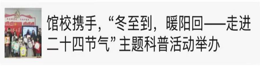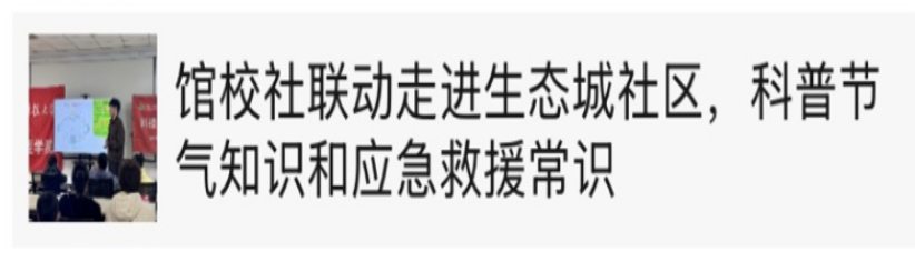 银龄科普宣讲团携手天津图书馆、中新友好图书馆、天津经开区蓝天救援队开展“科技+文化”科普宣讲活动数十场,银龄科普宣讲团带领学院众多师生依托专业学科知识,将大学“实验室”搬入社区“小课堂”,积极服务社会,助力青少年科学素养提升。系列活动被人民日报、学习强国、天津日报、津云、书香天津、北方网、搜狐、网易新闻、津滨海、齐鲁晚报、潇湘晨报等近二十个中央和地方媒体平台宣传报道近百次,被点击阅读量近六万次。推动区域家校社协同育人“教联体”建设,搭建大中小思政一体化建设“新模式”。