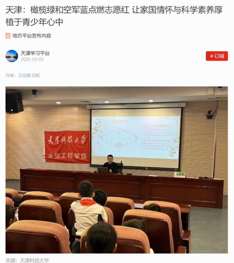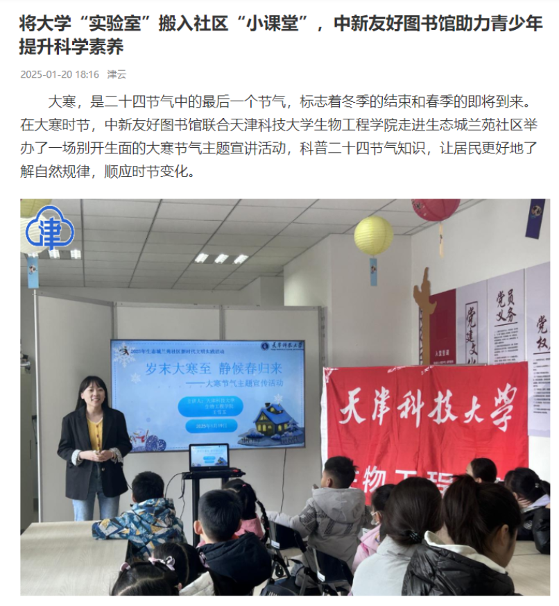 银龄科普宣讲团服务社会成效显著,在天津市众多社区、中小学和公共图书馆中开展科普宣讲活动,助推全域科普向纵深发展,受益人群达数千人。特别是将生物工程知识与二十四节气、中华传统节日等相结合,走进众多社区、中小学、公共图书馆,已经形成系列活动,活动周期贯穿全年。该宣讲团与中新友好图书馆联合开展的“舌尖上的非遗-走进二十四节气”系列宣讲活动,走进生态城数十个社区、学校,受到社区居民和青少年好评,社区氛围更和谐、亲子关系更融洽,众多青少年在各级各类科技竞赛中取得好成绩;该宣讲团还与天津图书馆联合打造了“知行工坊”,受到广大市民和青少年好评。同时,银龄科普宣讲团推出了网络宣传平台“知行研习工作室”微信视频号,线上、线下同步推进科普思政工作,受到广大居民的喜爱和关注。