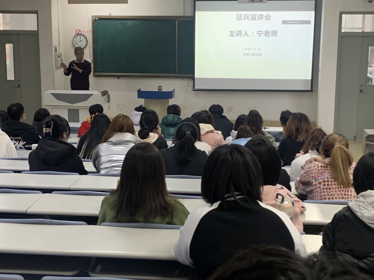 会上,宁老师通过结合当前征兵工作的新形势、新特点,详细介绍了国家征兵政策及大学生应征入伍的各项优待政策,并号召同学们带着青春梦想,树立起携笔从戎、建功军营、报效祖国的成才之志,自觉接受祖国挑选,从校园走进军营施展才华,为实现伟大的“中国梦”“强军梦”贡献出自己的一份力量。