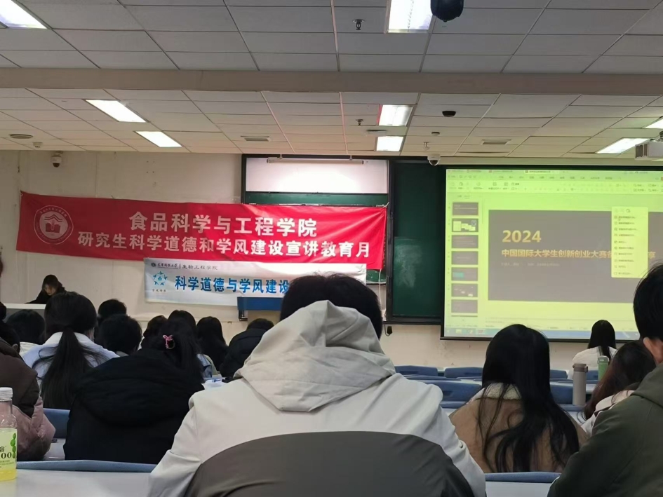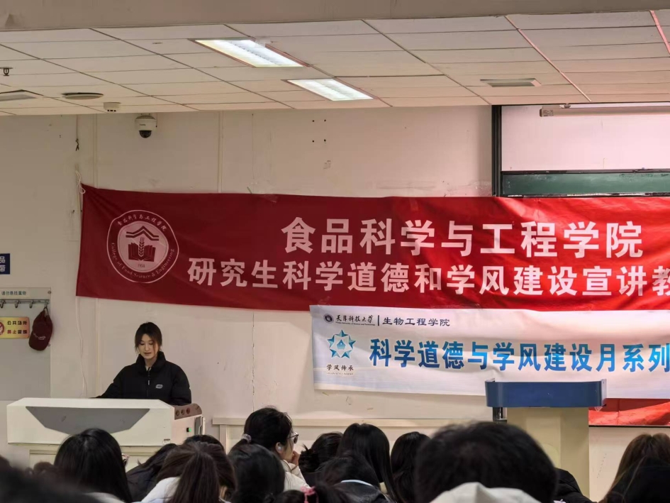 与食品科学与工程学院联合举办了2024年研究生科学道德与学风建设月主题系列宣讲活动。在第九讲中特别邀请到中国国际大学生创新大赛(2024)天津赛区高校主赛道金奖获得者罗虹同学,与同学们分享她的竞赛学习经验和科研感悟。