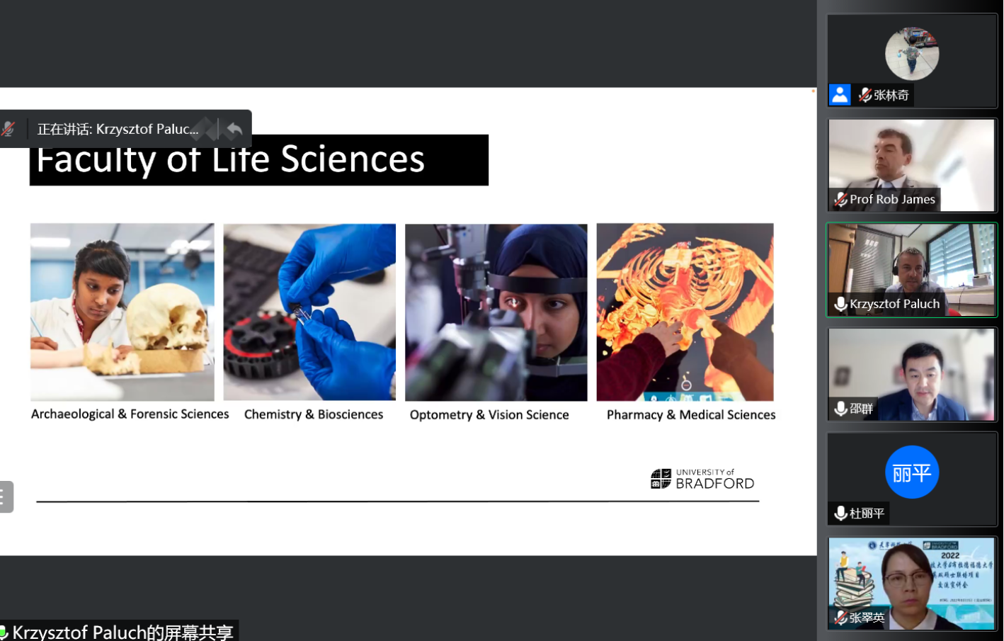 与布拉德福德大学硕士双学位联合培养项目举办2022年线上交流宣讲会。英国布拉德福德大学生命科学学院院长Rob James、副院长Mohammad Isreb、副院长Krzysztof Paluch和该校开放式创新中心副主任邵群、中国办公室副主任宋峥,我校国际交流处副处长赵佩钦、研究生院副院长万丽丽、哔咔漫画
