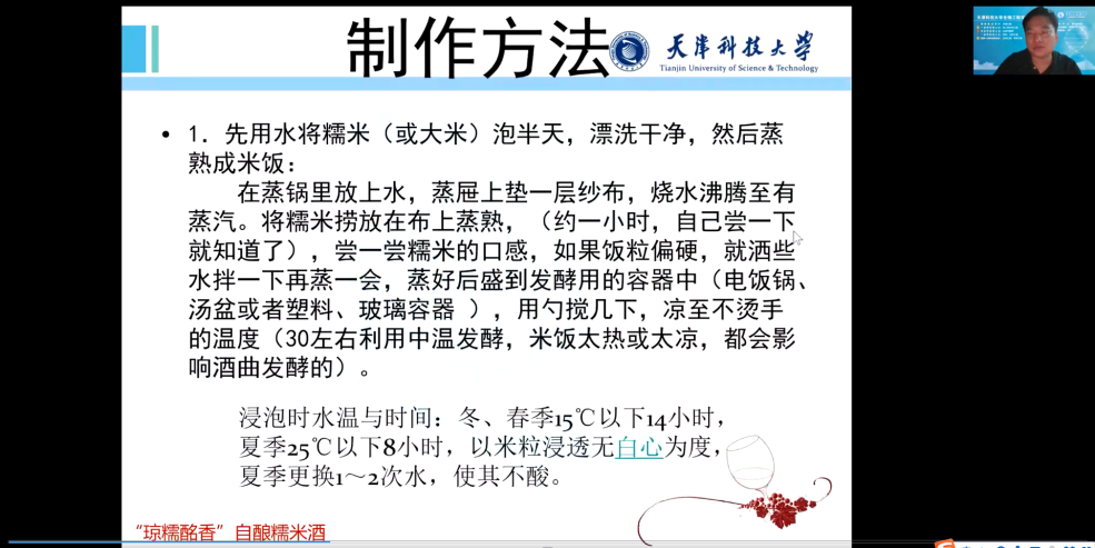 本次宣讲会共分为赛制介绍、酿造工艺讲解和参赛经验分享三个阶段。大会伊始,组委会就本届自酿糯米酒大赛赛程安排和赛制规则进行介绍。本次大赛共设有“青春献礼二十大,强国有我新征程”、“中华传统酒文化”两个主题赛道,各团队自主确定参赛主题、团队名称、文化理念等,最终将在决赛阶段展示团队建设成果。